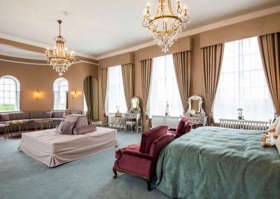 The beautiful master suite offers an emperor size bed, a seating area, dressing area, vast en-suite bathroom with separate freestanding bath and walk-in shower, and 15 sash windows with beautiful views. There is also a king size sofa bed available.